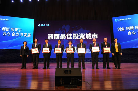 峰會下半場舉行了“商會十年——浙商最佳投資城市” 頒獎。 淄博、聊城、泰安(地級市),滕州市、鄒城市、棲霞市、肥城市、莘縣、茌平縣、寧陽縣、汶上縣、濟陽縣、五蓮縣、沂源縣、煙臺東部海洋經濟新區、東營經濟技術開發區、濟寧任城經濟開發區、濰坊寒亭區等3市15縣(市)區脫穎而出,被評為浙商最佳投資城市。