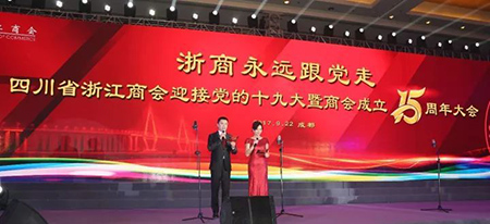 下午2點(diǎn)30分,“浙商永遠(yuǎn)跟黨走,四川省浙江商會迎接黨的十九大暨商會成立十五周年大會”,在雄壯的國歌聲中拉開帷幕。大會首先播放了來自全國各地浙江商會《祝福四川浙商》視頻和《不忘初心跟黨走》的商會十五周年回顧片,以及商會發(fā)揮聯(lián)系企業(yè)廣的獨(dú)特作用、組織和引導(dǎo)會員參與四川精準(zhǔn)扶貧《脫貧路上手挽手》的工作紀(jì)實(shí)片。四川省浙江商會會長、四川省城鎮(zhèn)建設(shè)綜合開發(fā)有限公司董事長陳朝欽,回顧了十五年來商會團(tuán)結(jié)帶領(lǐng)在川浙商,始終堅持辦會的理念和宗旨,以“服務(wù)立會、服務(wù)興會、服務(wù)強(qiáng)會”為立足點(diǎn),充分發(fā)揮社會組織的橋梁紐帶和政治引領(lǐng)作用,深化服務(wù)內(nèi)涵,拓展服務(wù)領(lǐng)域,創(chuàng)新服務(wù)方式,不斷加強(qiáng)商會建設(shè),提升商會服務(wù)會員、服務(wù)川浙、服務(wù)社會的能力,參與四川經(jīng)濟(jì)建設(shè)、服務(wù)川浙經(jīng)濟(jì)社會發(fā)展的歷程。十五年來,浙商累計在川投資4200多億元;商會及廣大會員參與精準(zhǔn)扶貧、幫扶弱勢群體、熱心慈善公益、馳援搶險賑災(zāi)等捐款捐物累計超3億元。