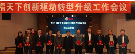 公司副總裁李松濤在會(huì)上作了《福天下轉(zhuǎn)型升級(jí)技術(shù)創(chuàng)新路徑解析》報(bào)告。公司高管相繼發(fā)言,全體與會(huì)人員與公司高層一起分組討論了技術(shù)創(chuàng)新路徑。會(huì)議審議通過(guò)了相關(guān)議程,劉煊苗與所有已經(jīng)啟動(dòng)轉(zhuǎn)型升級(jí)的43位大區(qū)經(jīng)理簽訂了《合作協(xié)議書》。
