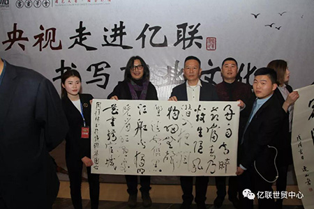 4月14日下午,央視書畫頻道組織中國美協顧問尼瑪澤仁,中國書協顧問胡抗美、張改琴,中國書協副主席包俊宜等30位全國著名書畫藝術家走進億聯集團,走進億聯世貿中心,書寫億聯企業文化。山東省浙江商會常務副會長、菏澤市浙江商會會長、億聯控股集團總裁包松安,億聯世貿中心總經理吳開鋒等陪同參觀。