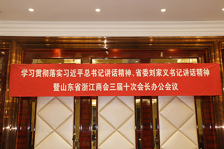 首屆全國工商聯主席高端峰會在濟舉行期間,11月7日,山東省浙江商會在濟南·山東大廈召開學習貫徹落實習近平總書記講話精神、省委劉家義書記講話精神暨山東省浙江商會三屆十次會長辦公會議。章鵬飛會長通報分享了參加山東省民營企業家座談會情況,會長們學習習近平總書記、省委劉家義書記講話精神并作交流分享,會議表決增補商會(常務)副會長,執行會長輪值期調整,還就有關事宜作了通報。孫延偉秘書長主持會議。章鵬飛會長特別邀請了來魯出席首屆全國工商聯主席高端峰會的上海市浙江青年企業家協會會長、均瑤集團總裁王均豪,傳化物流集團執行總裁徐炎,棗莊市投資促進局局長岳增波來到會議現場并講話。