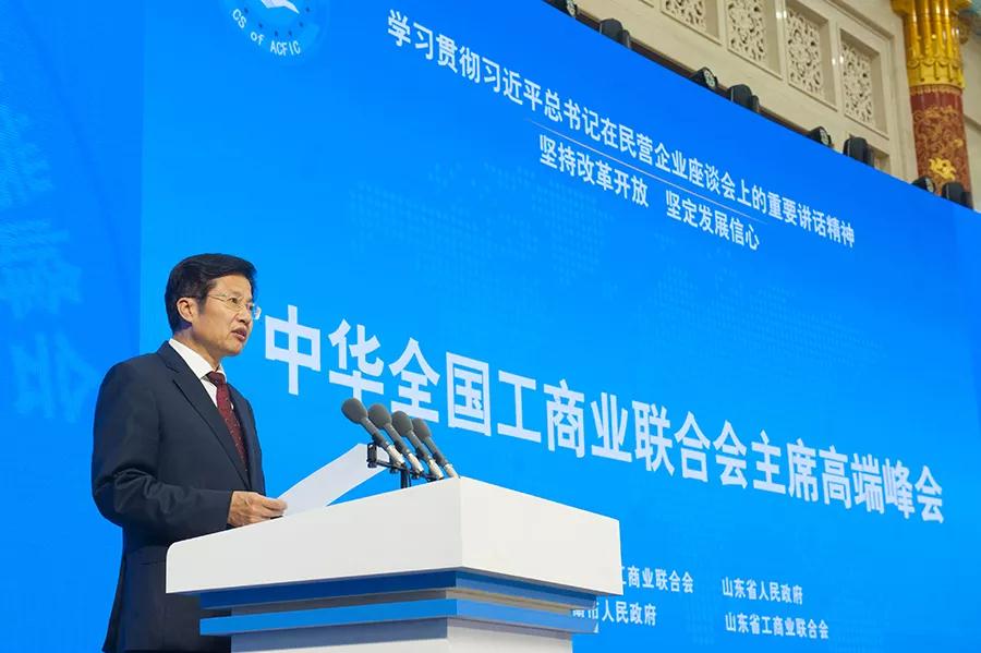 在全國深入學習貫徹習近平總書記關于民營經濟發展一系列重要講話,特別是11月1日在民營企業座談會上的重要講話精神之際,8日上午,以“堅持改革開放堅定發展信心”為主題的首屆全國工商聯主席高端峰會在濟南舉行。全國政協副主席、全國工商聯主席高云龍出席會議并作主旨講話。山東省委書記、省人大常委會主任劉家義出席會議并致辭。中央統戰部副部長、全國工商聯黨組書記、常務副主席徐樂江主持會議。山東省政協主席付志方、省委副書記楊東奇出席。