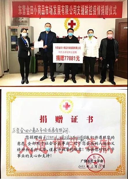 集團旗下廣饒義烏小商品批發市場繼2月2日將緊急調集到的當前緊缺物資5000斤84消毒液、120個噴霧器、5000副手套捐贈廣饒縣紅十字會后,2月10日,公司總經理李濱及業主代表趙衍珠、李美玲到廣饒縣紅十字會,將本次活動募集到的77881元善款進行了捐贈,為抗擊疫情再貢獻一份力量。