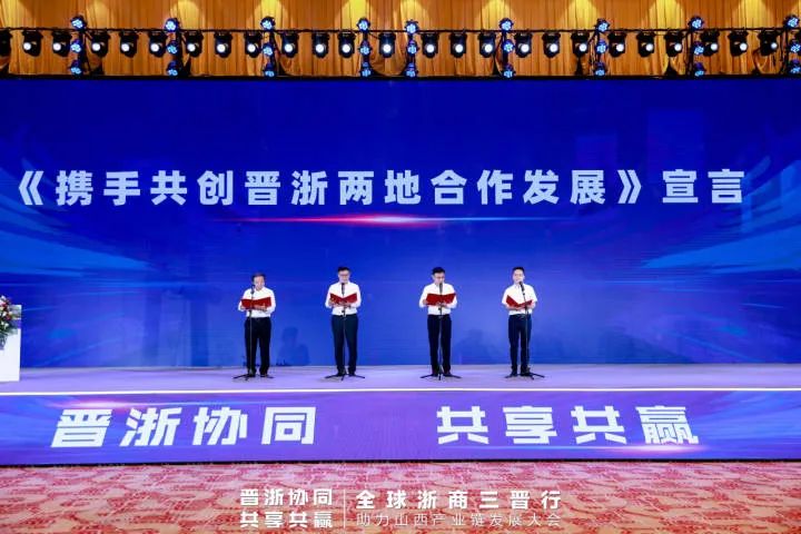 “古老厚重的沃土如今活力四射,我們自豪,我們自信,三晉大地正處處充滿無限生機。堅定轉型發展勇蹚新路,我們敢想,我們敢干,全方位推動高質量發展,浙商爭先!”山西省浙江企業聯合會會長彭衍吾,湖北省浙江企業聯合會會長何明東,美國浙杭同鄉會會長、杭州市僑商會執行會長丁德坤,浙江順聯網絡科技董事長郭洪安等4位浙商共同宣讀了《攜手共創晉浙兩地合作發展》宣言,異口同聲、鏗鏘有力,共同發出晉浙合作發展最強音,提出浙商要為培育壯大新動能貢獻浙商創業創新力量,為持續深化拓展能源革命綜合改革提供浙商實踐,為弘揚山西傳統文化、挖掘文旅資源奉獻浙商力量。