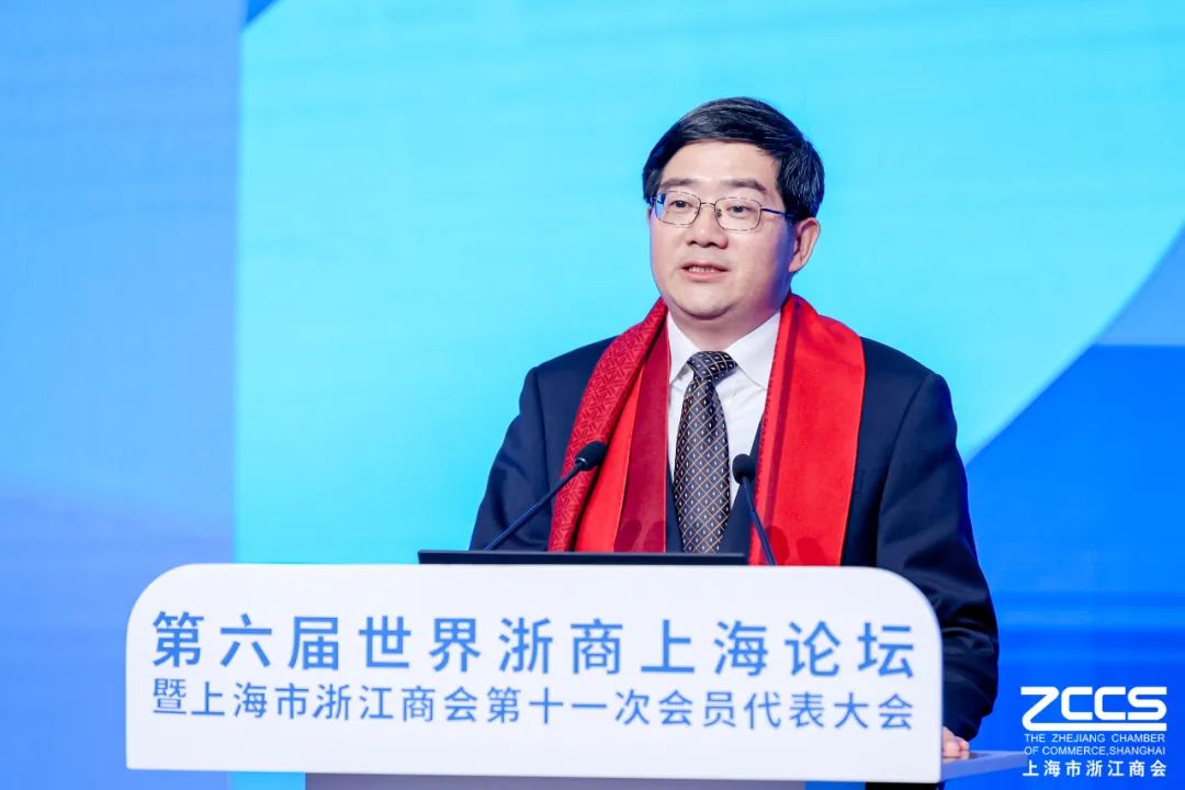 上海市委常委、統(tǒng)戰(zhàn)部部長 陳通 上海市委常委,統(tǒng)戰(zhàn)部長陳通在致辭中說,要以習(xí)近平新時代中國特色社會主義思想為指導(dǎo),學(xué)習(xí)貫徹習(xí)近平總書記關(guān)于民營經(jīng)濟(jì)發(fā)展的一系列重要講話精神,學(xué)習(xí)宣傳全國兩會精神,堅定信念,專心致志謀發(fā)展。上海一直就是浙江人打拼發(fā)展之地,浙商的“四千”精神與上海城市精神品格珠聯(lián)璧合、相得益彰、融為一爐。浙商是一支宏大的聽黨話跟黨走的愛國力量、宏大的社會主義事業(yè)的建設(shè)力量、宏大的全體人民共同富裕的推進(jìn)力量。在滬浙商聯(lián)結(jié)浙江和上海,有力促進(jìn)長三角更高質(zhì)量一體化發(fā)展,為上海經(jīng)濟(jì)社會發(fā)展做出了重要貢獻(xiàn)。他希望廣大民營企業(yè)家抓住上海強(qiáng)化“四大功能”,建設(shè)“五個中心”,實施長三角一體化發(fā)展、浦東引領(lǐng)區(qū)、虹橋國際開放樞紐等重大國家戰(zhàn)略等有利機(jī)遇,施展才華、建功立業(yè)。他說,你們奔赴上海,上海擁抱你們;你們扎根上海,上海愛護(hù)你們;你們投資上海,上海成就你們。期待上海浙江商會更好發(fā)揮平臺作用,團(tuán)結(jié)服務(wù)在滬浙商,努力建設(shè)成為模范商會、標(biāo)桿商會。