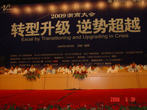 2009年5月30日上午,以“轉型升級、逆勢超越”為主題的2009浙商大會在浙江省人民大會堂隆重啟幕。我會會長章鵬飛,常務副會長金位海,副會長杜利峰、葉蘄萩、葉小東、蔣加良、吳昌碩、黃河,副秘書長張宗建、徐秀梅及會員單位代表20多人以及濟寧市政府、濰坊招商局、滕州市政府等單位領導參加了大會。近2000名國內外浙商和學者代表匯聚一堂,共謀應對挑戰、搶抓機遇、推動轉型升級和浙商群體發展大計。