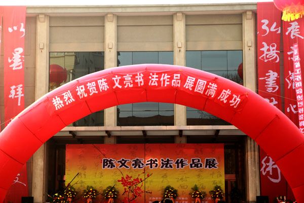 2012年1月7日上午,由山東省江蘇商會、山東省浙江商會主辦的商會高級顧問陳文亮書法作品展在山東省美術館開幕,章鵬飛會長出席并致辭。濟南軍區聯勤部原副政委、少將胡禮仁,濟南軍區原裝備部部長、少將朱文玉,濟南軍區聯勤部原副部長、少將何其祥,山東省人民政府副秘書長徐振基等軍區和政府領導,商會副會長和秘書長參加了開幕式,并觀摩了陳文亮顧問的經典創作。
