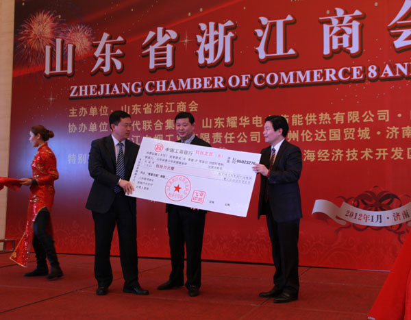 投資山東不忘回饋社會,在本次年會上山東省浙江商會向希望工程捐款50萬元。山東省希望辦副主任、山東青基會理事長副秘書長王太麗向商會頒發捐贈證書;共青團山東省委紀檢組長、山東青基會理事長謝寧致辭并授予商會“希望工程山東省浙江商會工作站”銅牌。